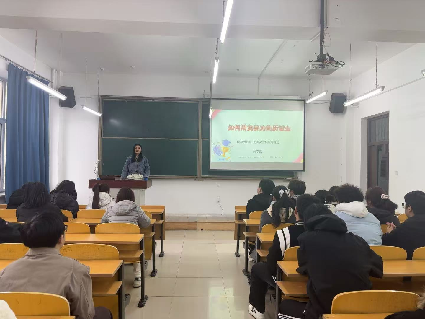 2025年10月15日,E路行专业社团(电子商务技能训练)联合财务数智化应用社团,举办“如何用竞赛为你的简历‘镀金’”主题讲座,由E路行社团指导教师刘老师主讲,40余名两社团成员聆听、学习。