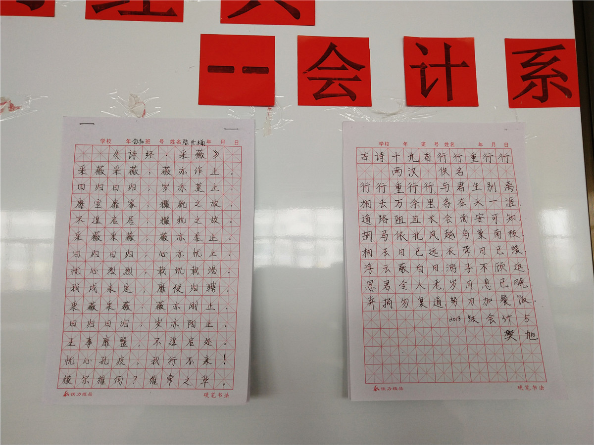 会计系围绕活动主题,为传承和弘扬中华民族诗词书法文化,延伸“读、写、讲、用”含义,立足于培养学生特点,发掘他们的优点,让同学们更加深刻领会本次活动。利用周三、周五晚自习或其他课余时间抄写文化经典内容、撰写学习心得,加深理解。开展了“诵读中华文化,书写文明经典”作品展。会计系2018级学生积极参加此次活动,并选出优秀作品在第二教学楼二楼进行展示。