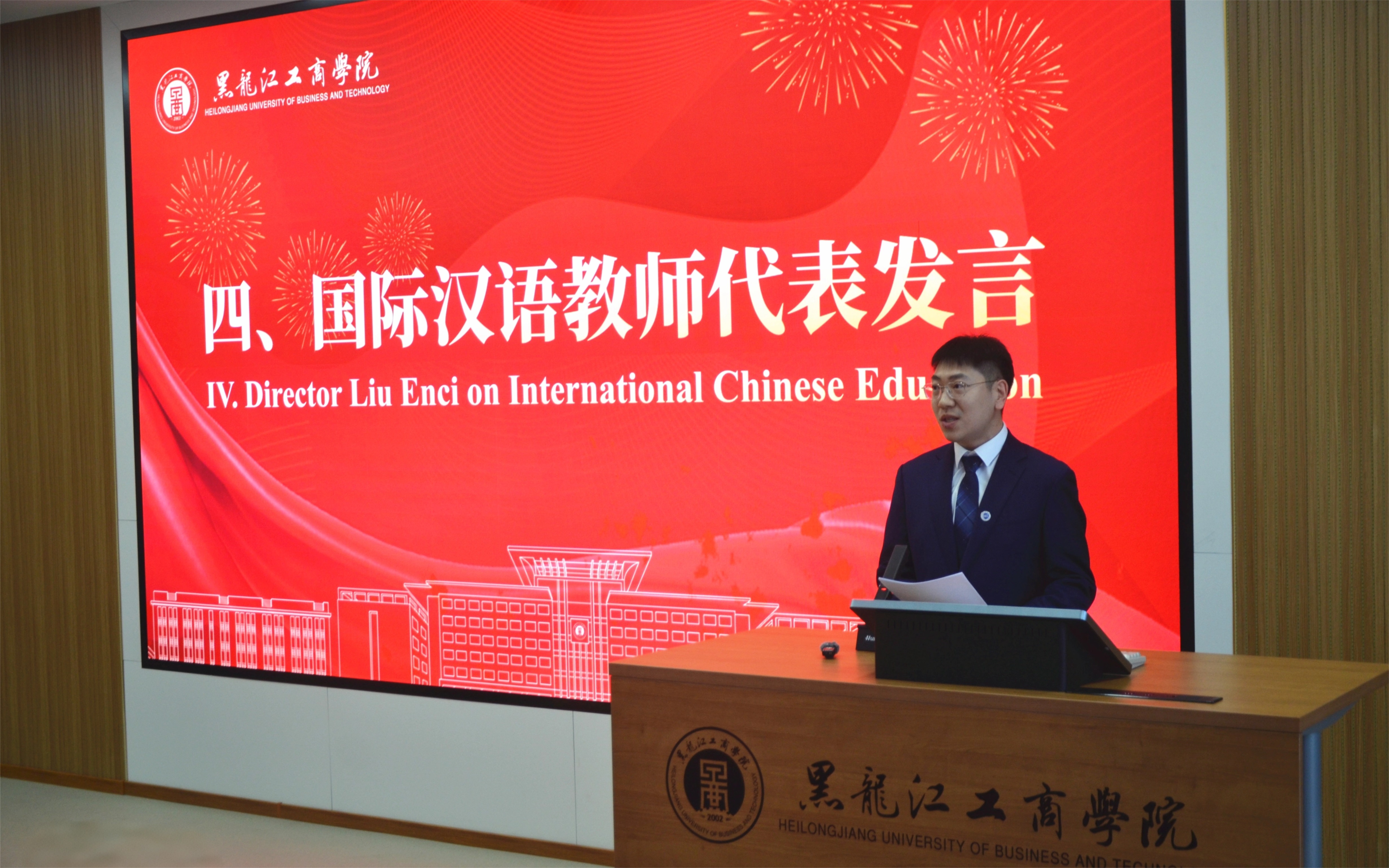 汉语国际教育教研室主任刘恩赐代表全体授课教师发言。他表示,全体教师将成为同学们这段跨国旅程中最可信赖的师长和朋友。一是要作同学们语言学习的“引路人”。以最大的耐心,传授汉语的语法规则和发音技巧,努力营造一个敢于试错、乐于表达的课堂,陪伴同学们走过这场语言的“马拉松”。二是要作同学们文化交流互鉴的“对话者”。开展丰富多彩的实践,带领大家体验博大精深的中华文化,共同成就“美美与共”的佳话。三是要作同学们异国生活里的“同行者”。学校永远是大家在中国的家,无论是学业上的瓶颈,还是生活中的困惑,老师的办公室大门永远敞开,为大家答疑解惑、排忧解难。