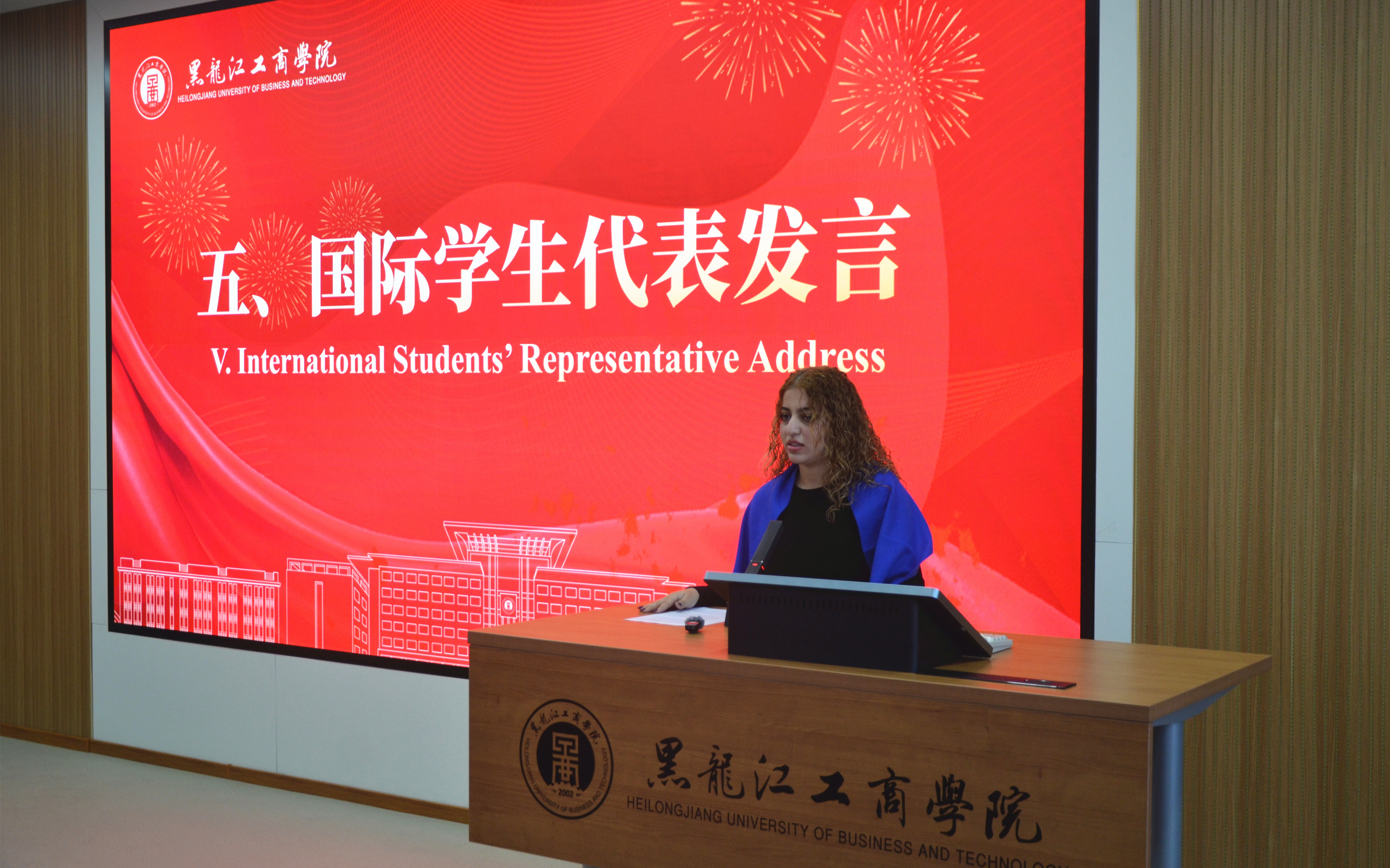 国际学生代表Hiba Kesstaou在发言中,代表全体同学向学校和老师们致以最诚挚的感谢。她动情地表示,学校的精心安排和师长的热情帮助,让大家迅速融入新环境,感受到哈尔滨这座城市的热情好客,更体会到了如家一般的温暖。她表示,能在中国求学是一次宝贵的机会,这所大学已成为大家的第二个家园。期待着与中国同学并肩学习、交流文化、共同奋斗。全体国际学生定将不负韶华,勤奋钻研,互帮互助,用优异的成绩书写一段骄傲的留学篇章。