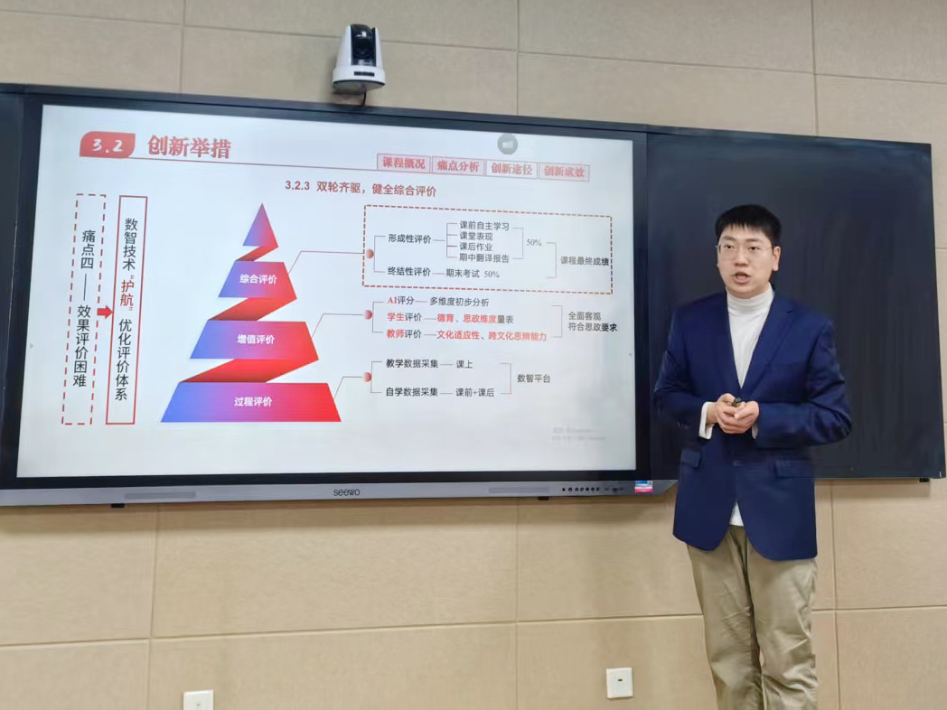 刘恩赐始终坚持以学生为中心,注重教学创新和课堂互动,引导外国语专业学生讲好中国故事,传播中国声音。主讲的《理解当代中国——汉英翻译》课程以“中国特色大国外交”为主题,以“人类命运共同体”为切入点,采用线上线下融合教学模式,适当融入AI技术,实现“课前讨论—课中讲授—课后总结”的全流程赋能。课程帮助学生深入理解“一带一路”的时代内涵和中国特色大国外交的重要意义,有效提升了跨文化表达能力与国际传播意识。