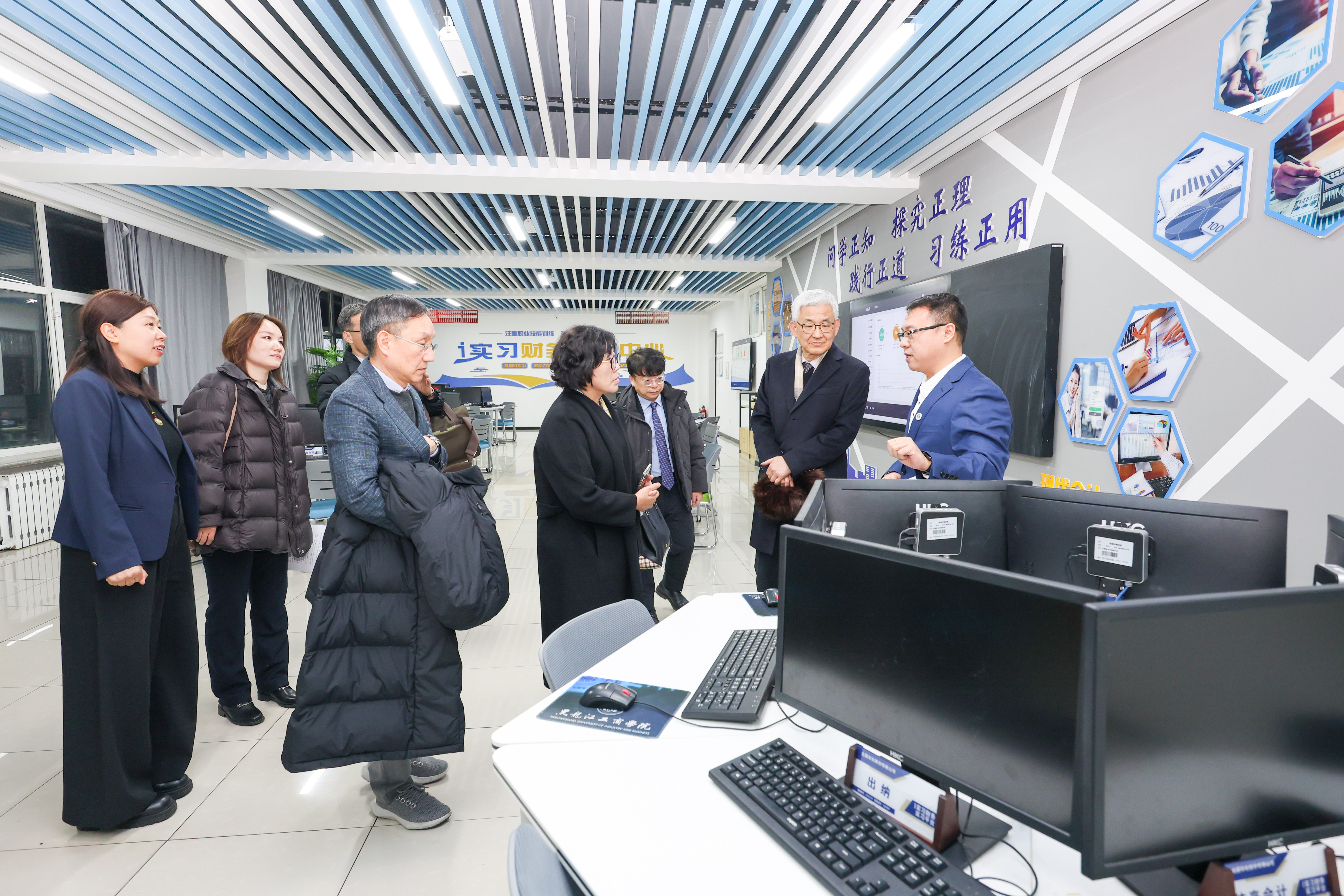 访问期间,任秊洙校长一行参观了我校“教育部新金融智慧学习工场”。国际教育学院、智能制造与交通工程学院、艺术与传媒学院负责人陪同参观。
