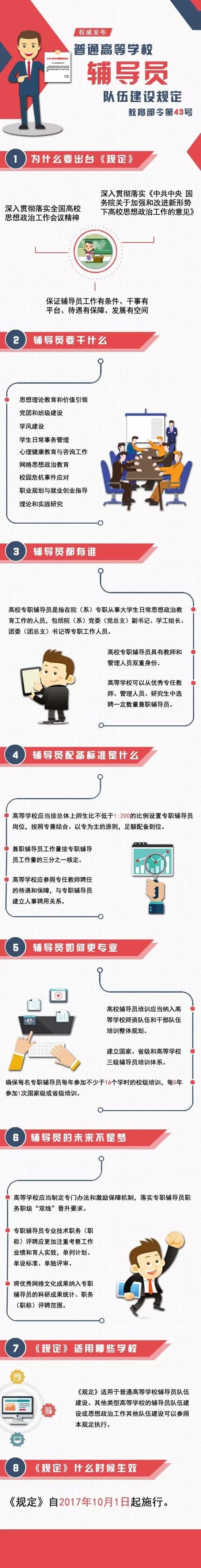 第四条 辅导员工作的要求是:恪守爱国守法、敬业爱生、育人为本、终身学习、为人师表的职业守则;围绕学生、关照学生、服务学生,把握学生成长规律,不断提高学生思想水平、政治觉悟、道德品质、文化素养;引导学生正确认识世界和中国发展大势、正确认识中国特色和国际比较、正确认识时代责任和历史使命、正确认识远大抱负和脚踏实地,成为又红又专、德才兼备、全面发展的中国特色社会主义合格建设者和可靠接班人。