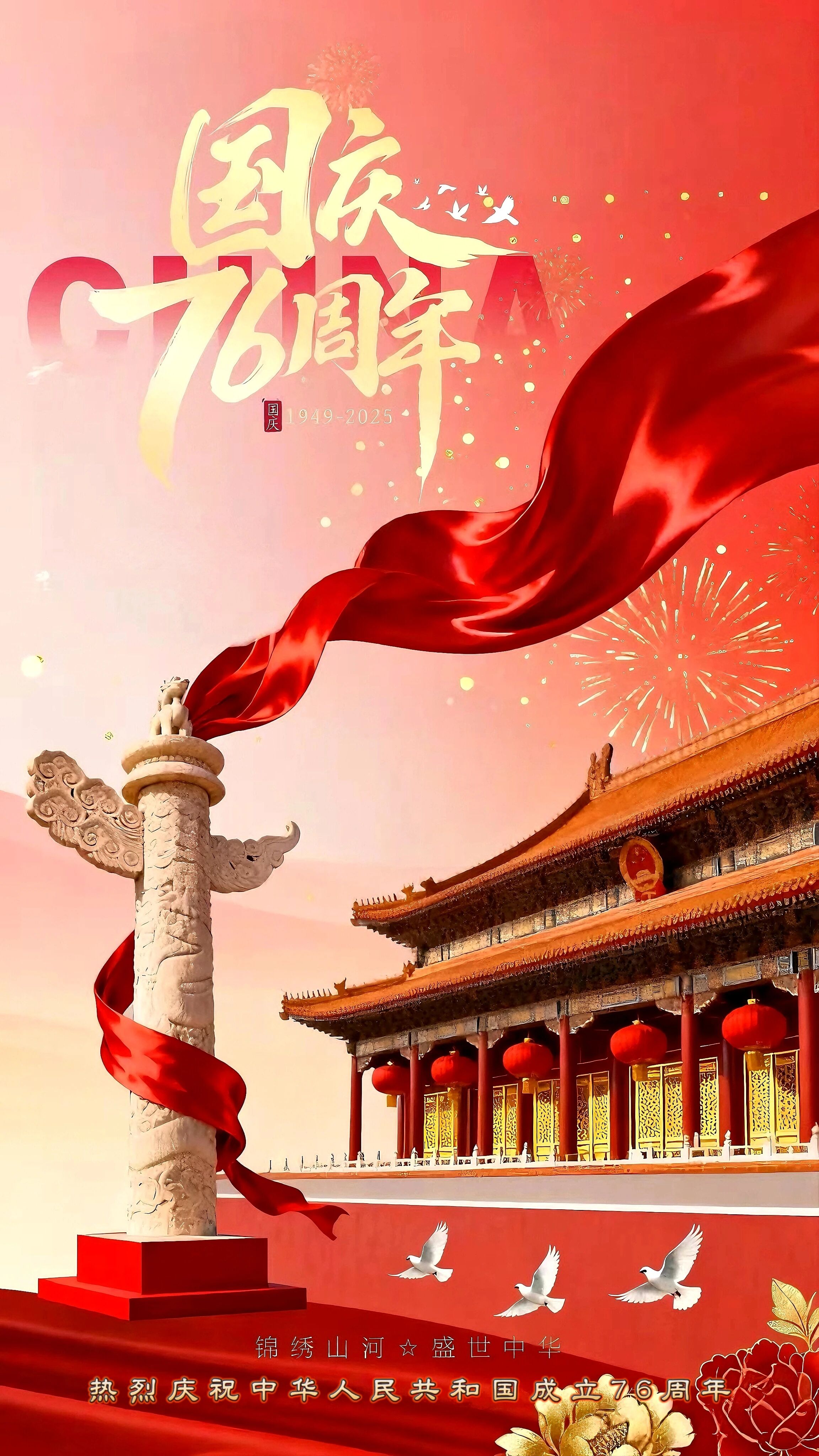 金秋颂国,华诞传情。在这个洋溢着自豪与喜悦的季节,我们共同庆祝中华人民共和国76周年华诞。七十六载砥砺奋进,七十六载春华秋实。今日之中国,经济腾飞,科技自强,文化繁荣,一幅生机勃勃、欣欣向荣的盛世画卷正在神州大地恢宏铺展。这一项项成就的取得,无不凝聚着亿万人民的智慧汗水与无悔奉献——国家的宏大叙事,正是由每一个奋斗者的平凡足迹共同写就。