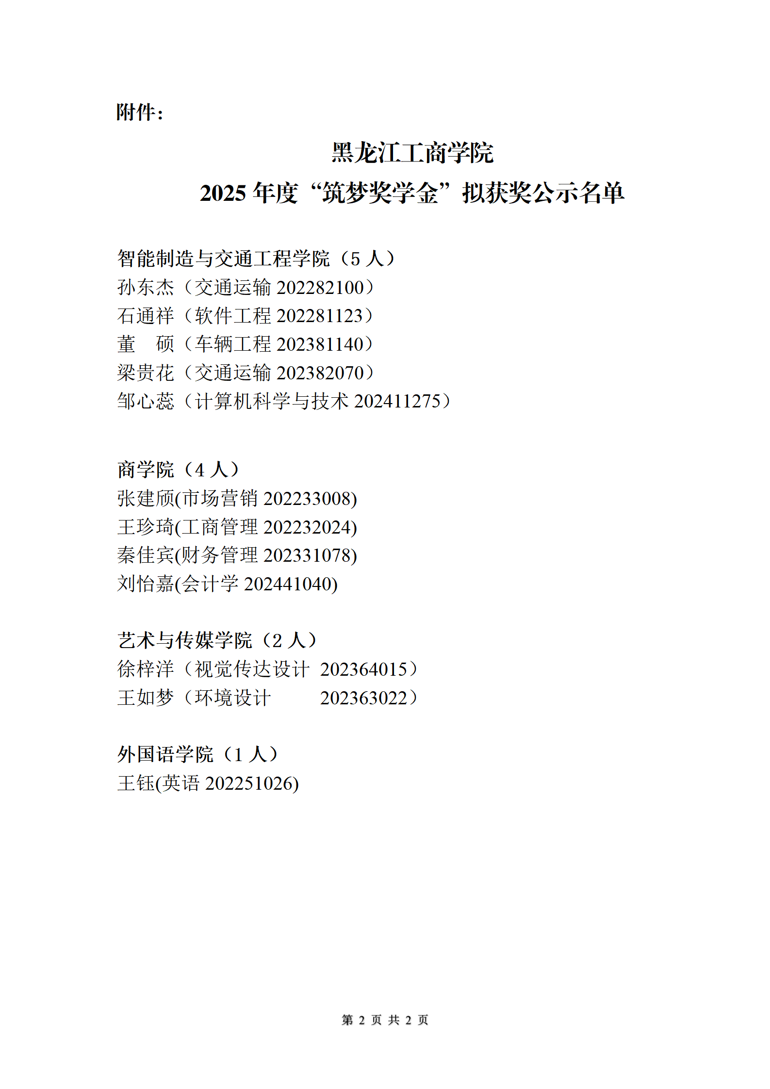 根据《关于开展2025年度“筑梦奖学金”评选工作的通知》(黑工商学发〔2025〕22号)文件要求,经个人申报、学院联评、学校评审,拟推荐我校孙东杰等12名学生为2025年度“筑梦奖学金”人选,为确保评选工作的公平、公正和严肃性,现予公示(具体名单详见附件)。
