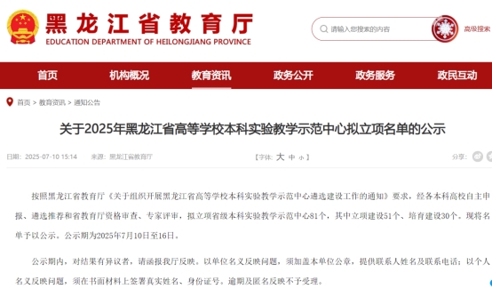 (图为2025年黑龙江省高等学校本科实验教学示范中心拟立项名单公示)