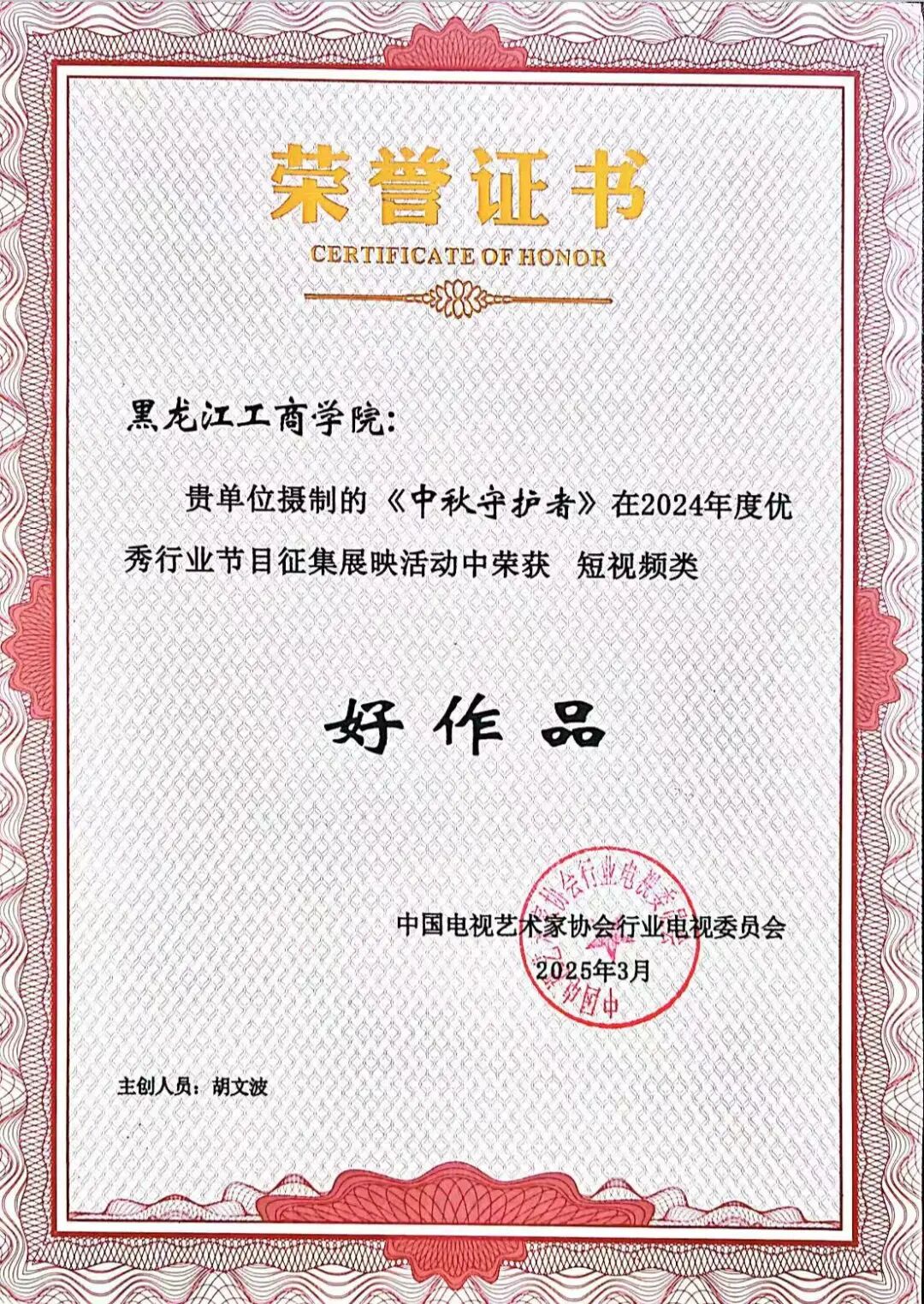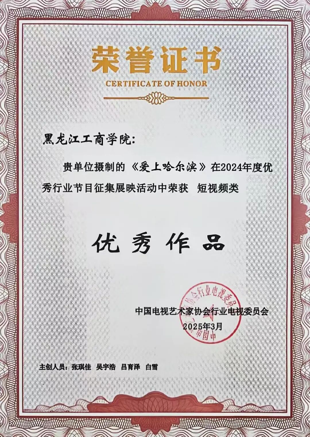 近日,中国电视艺术家协会公布2024年度优秀行业节目征集展映活动获奖名单,黑龙江工商学院艺术与传媒学院教师团队创作的两部短视频作品《爱上哈尔滨》《中秋守护者》分别荣获“短视频类优秀作品”与“短视频类好作品”两项殊荣,彰显学院在影视创作领域的多元实力与创新活力。