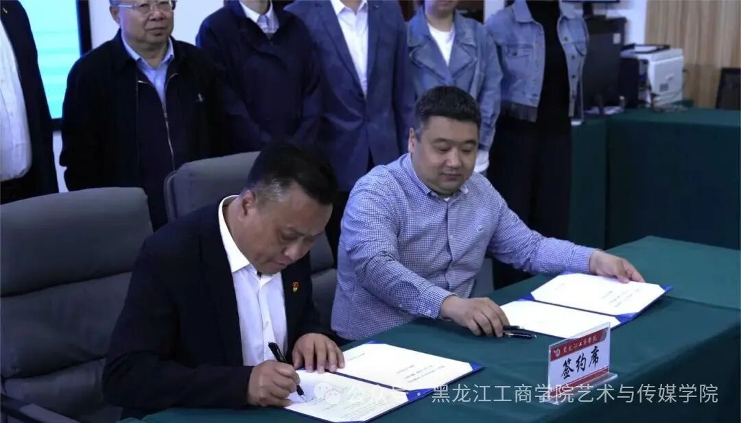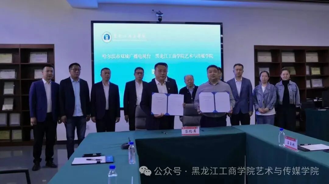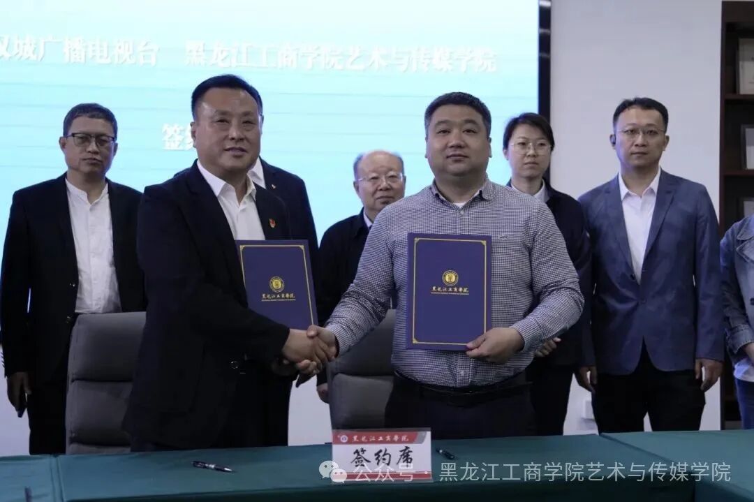 近日,黑龙江工商学院艺术与传媒学院与哈尔滨市双城广播电视台正式签署战略合作协议,标志着双方在媒体融合、人才培养、文化传播等领域迈入深度合作新阶段。出席仪式的领导有双城区委宣传部副部长、广播电视台党委书记、台长许国腾,哈尔滨市双城广播电视台副台长李德然、苏本龙、杨波,机关党委副书记李树明 ,党务行政办公室主任郑丰华。黑龙江工商学院副校长孙智慧,艺术与传媒学院院长马浩瀚,党总支书记董迪,副院长管营,播音与主持艺术专业主任王丹,广播电视编导专业主任王玉娇,此次合作旨在发挥高校智力资源与地方媒体平台优势,共同探索“产教融合、协同育人”的创新路径,为双城区文化产业发展注入新动能。